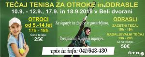 Tečaj tenisa za otroke in odrasle15. avgust 2018Tečaji tenisa bodo potekali v Beli dvorani v naslednjih terminih: od 10.9. do 12.9.2018, 17.9. in 18.9.2018. Za loparje je poskrbljeno. Za vač informacij in vpis pokličite 041 643 430.